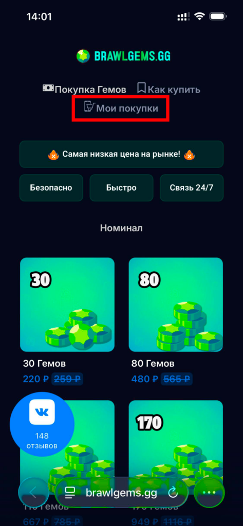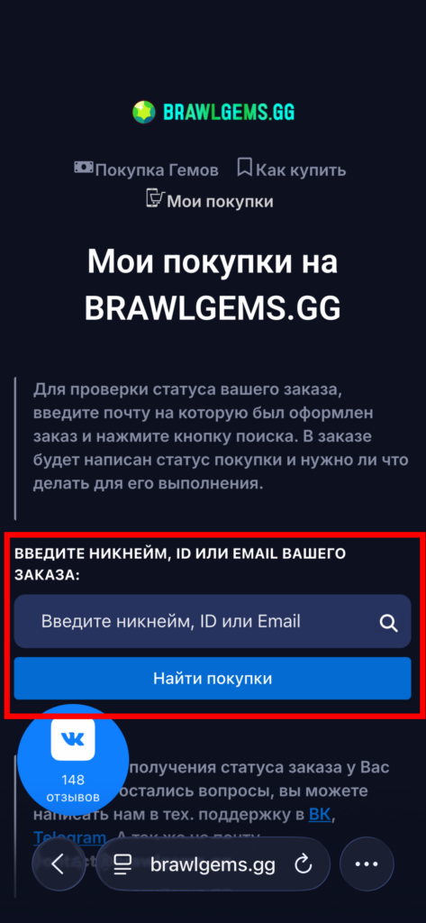 9. Заходим на сайт brawlgems.gg и переходим на вкладку сверху Мои покупки