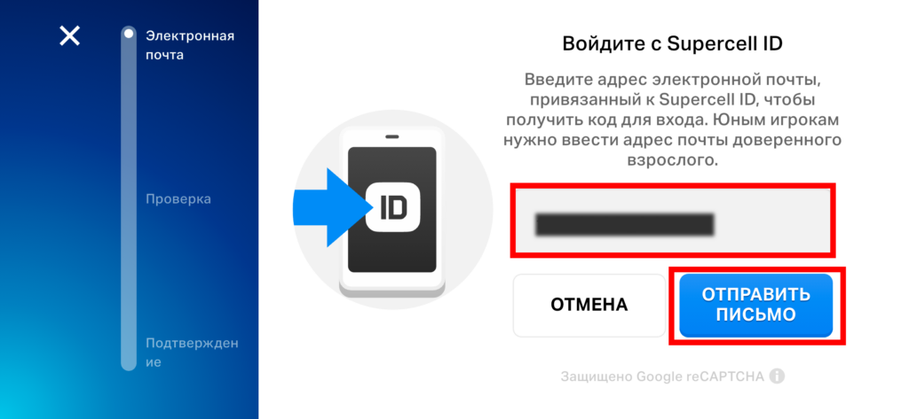 Далее, вводим почту, привязанную к нашему аккаунту SUPERCELL ID и НАЖИМАЕМ КНОПКУ «КУПИТЬ». Если вдруг Вы забыли, к какой почте привязан аккаунт, то инструкция по поиску будет распологаться немного ниже.