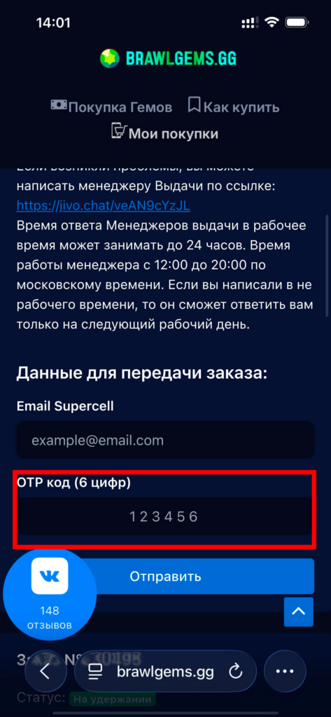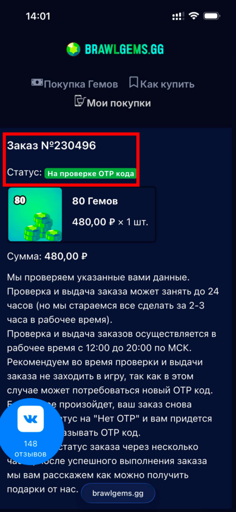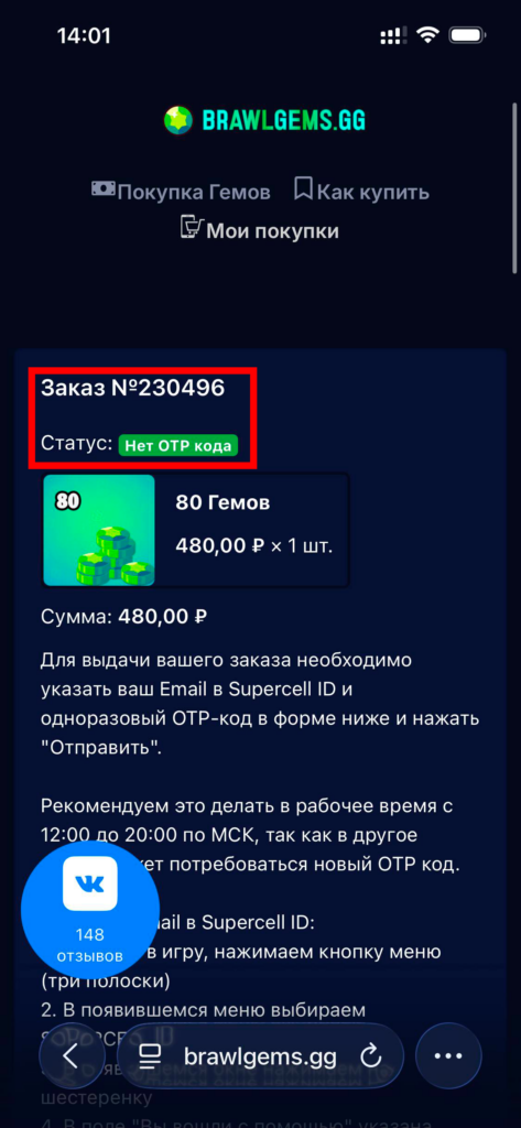 14. Не забывайте проверять статус заказа. Как появится статус “Выполнен” — Валюта успешно куплена на ваш аккаунт в Brawl Stars